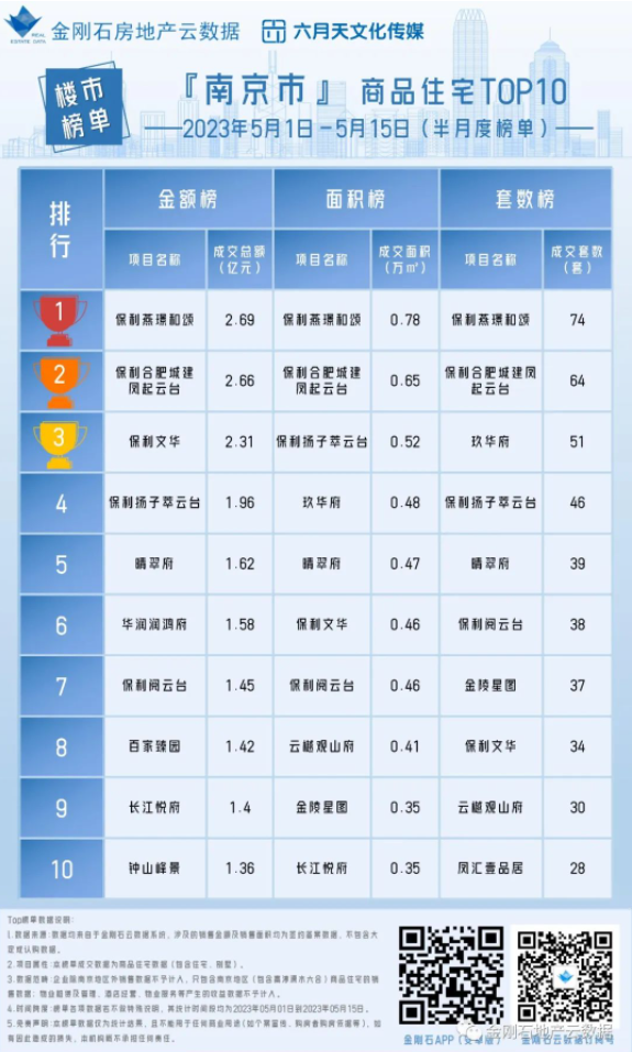 据金刚石云数据统计,2023年5月1日至5月15日,南京商品房成交量24.64万㎡,同比下跌27.36%,环比下跌17.56%。成交主力集中在南部新城、铁心桥、燕子矶等抗跌性较强的热门板块,其中保利燕璟和颂、保利合肥城建凤起云台、保利扬子萃云台三盘在5月上旬销售面积排名前三;在房地产市场比较萧条,缺乏升温动力的情况下,外围板块推盘节奏放缓,去化不佳,均以去库存为主。