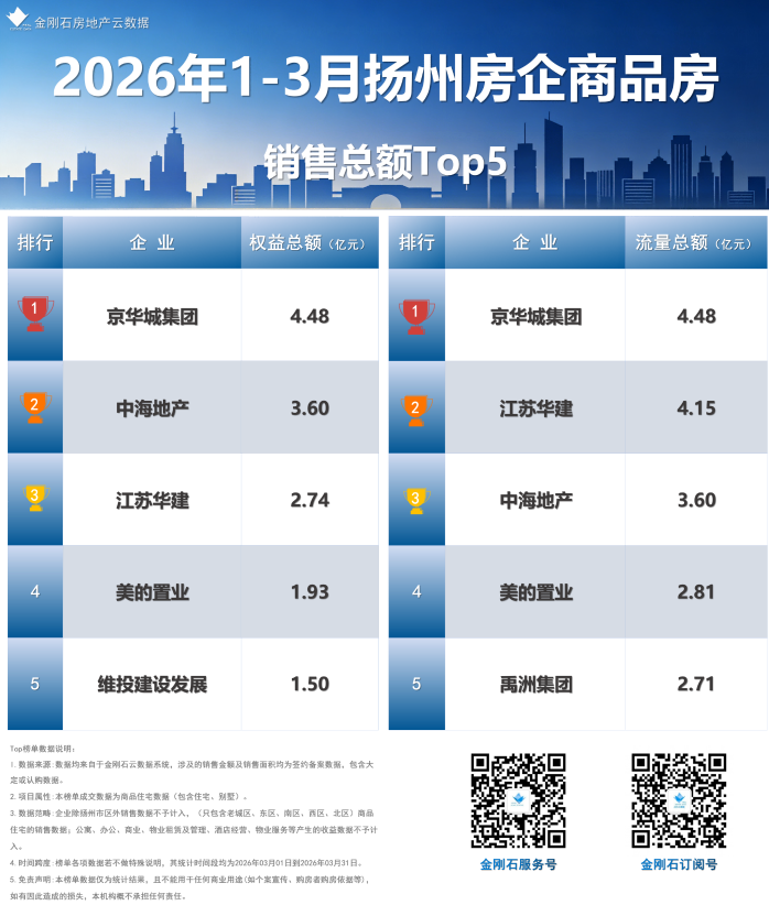 金刚石扬州市区2026年1-3月、2026年03月商品房销售数据重磅出炉。