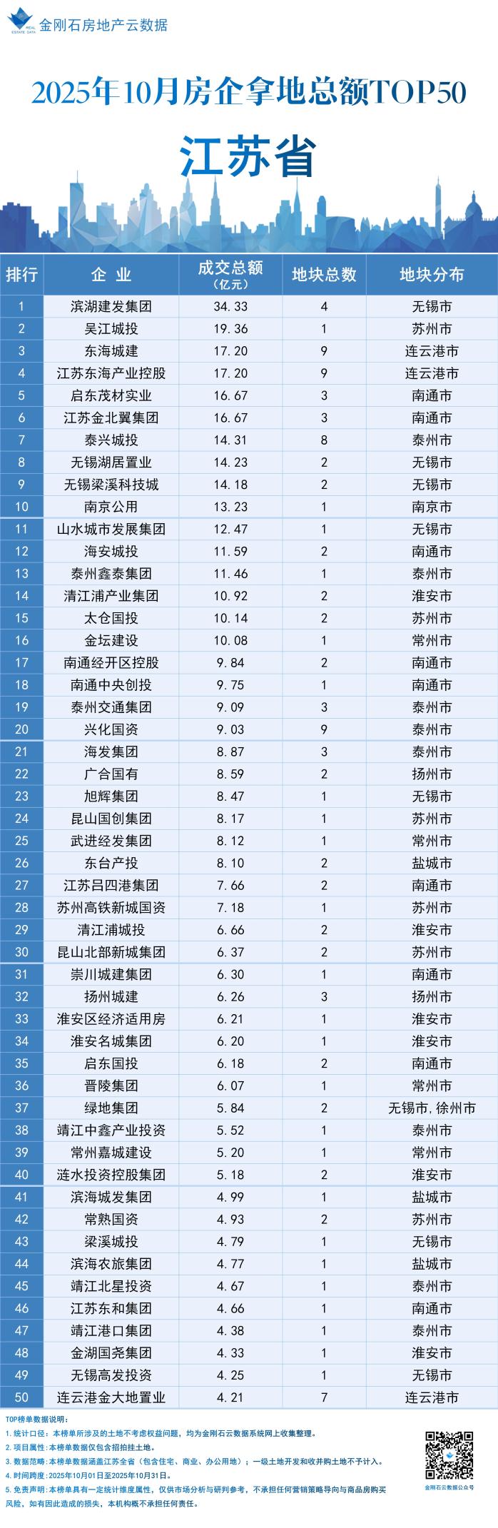 金刚石江苏省2025年10月房企拿地金额排行榜重磅出炉。