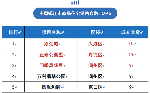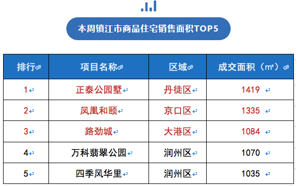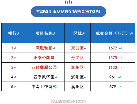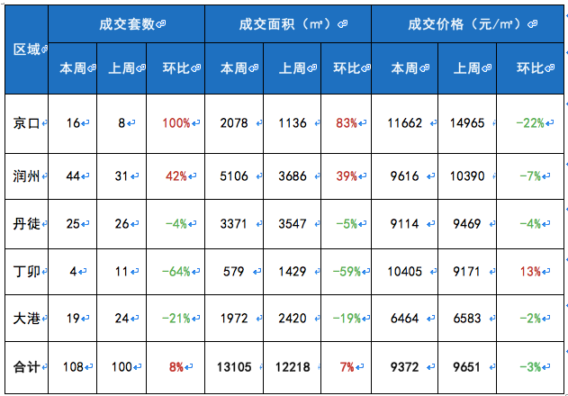 本周镇江市商品住宅主要成交区域为润州区,成交面积0.51万㎡,环比上升39%,成交套数44套,环比上升55%,成交均价9616元/㎡,环比下跌7%。