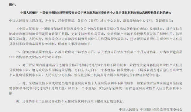央行与银保监会联合发布了《建立首套住房贷款利率政策动态调整机制》,下附全文截图,可以放大图片阅读。