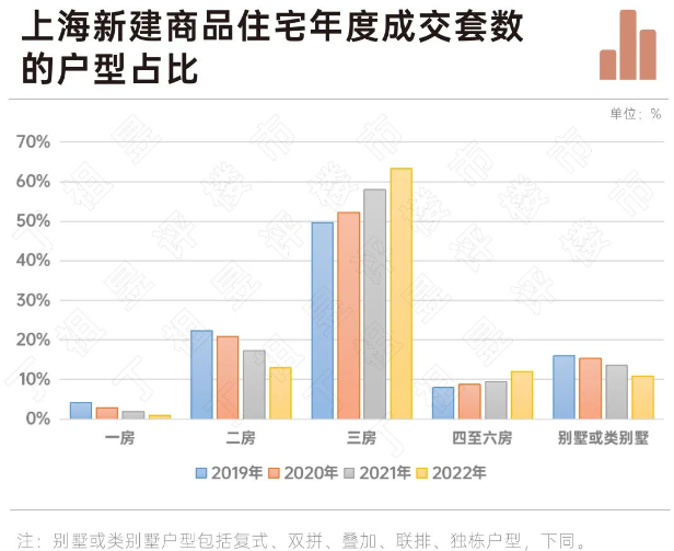 过去几年,上海三房及以上户型热度不断提升,尤其三房成交套数占比高达63%,是市场的绝对主力。小户型新房越来越少,一房已经基本退出市场。