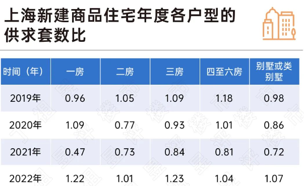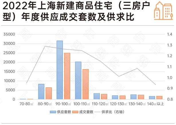 2022年,上海楼市整体供过于求,在市场主力的三房户型中这一趋势也尤为明显。80-140㎡三房产品的供求比均大于1,尤其是供求主力的90-110㎡面积段三房,供求比超过1.25。更奢侈的140㎡以上面积段三房供求比相对均衡,约为0.94。