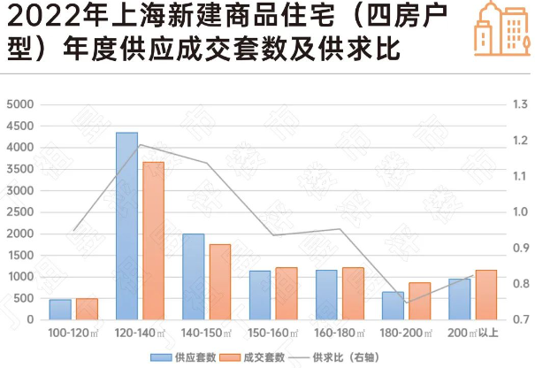 上海新房市场,四房产品的成交占比连续4年呈缓慢上升的趋势,2022年约占12%。相比三房产品,四房产品更加供不应求。其中,120-150㎡面积段是供应和成交的主力,2022年供求比约为1.17,而150㎡以上各面积段的四房产品的供求比均小于1,供不应求的状况非常明显。