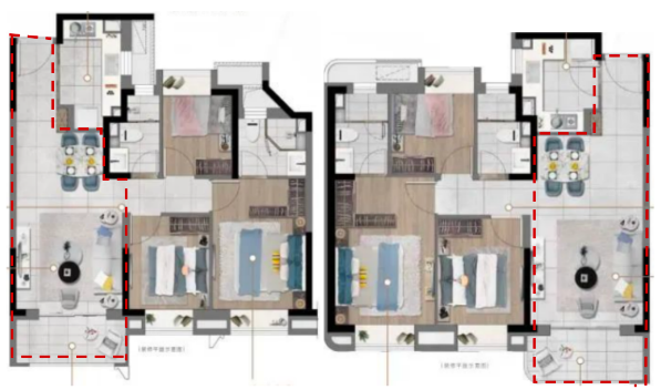 由于面积限制,这一面积段三房户型都很注重公区一体化设计。临港新城的中建玖海云天多个户型均采用客餐厅一体的设计方式,客厅和餐厅之间没有隔断,扩大公区视觉空间,各自功能独立且能够基本满足使用要求。