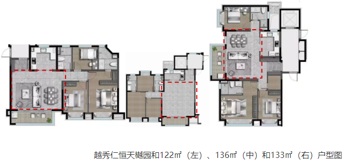 如闵行春申板块热销的越秀仁恒天樾园和,其122㎡三房户型采用横厅设计,采光面奢阔,136㎡三房面宽与进深均衡,方厅面积非常宽敞,甚至可以隔出独立功能间,而133㎡户型为欣赏社区中央景观,因地制宜的采用侧厅设计,窗墙比大幅提升,具备较强的时尚感。