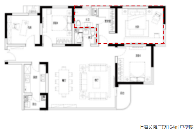 高端改善型四房注重为主卧套房叠加更多奢享功能。比如上海长滩三期为滨江景观房,以164㎡四房户型为例,其主卧套房不仅有以承重墙作为隔断的独立衣帽间,更有摆放休息沙发的休息区,正对270°观景窗,更能享受窗外江景。