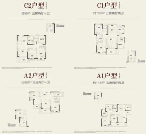 项目户型以三房两厅的舒适改善型产品为主,其建筑面积约95-118㎡精奢小高层、125-132宽景洋房的全系户型,满足不同家庭结构需求的客户,首选即终选。超高得房率,超大采光面,时刻感受人、建筑、自然三者的和谐统一。