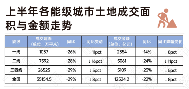 与2022年同期相比,各能级城市的土地成交均呈现量跌、价涨的趋势,但变动幅度略有差异。其中,三四线城市上半年土地成交量价降幅最大,成交规模同比减少29%,成交金额下降23%;二线城市其次,成交建面同比下降28%,成交金额下降24%;一线城市降幅最小,成交建面、金额同比降幅分别为26%和14%。