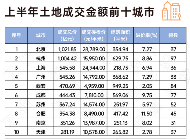 上半年卖地揽金超千亿的城市有2个,分别是北京和杭州,成交金额为1022亿元和1004亿元,其中北京的成交金额较去年同期接近持平,微降1%,杭州跌幅则高达33%。