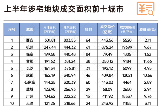 根据统计,今年上半年土地成交面积最多的城市是西安,成交面积949万平米,同比增长9%,其次是石家庄,成交面积633万平米,同比增46%,杭州以630万平米位居第三,但与去年同期相比,跌幅高达44%。