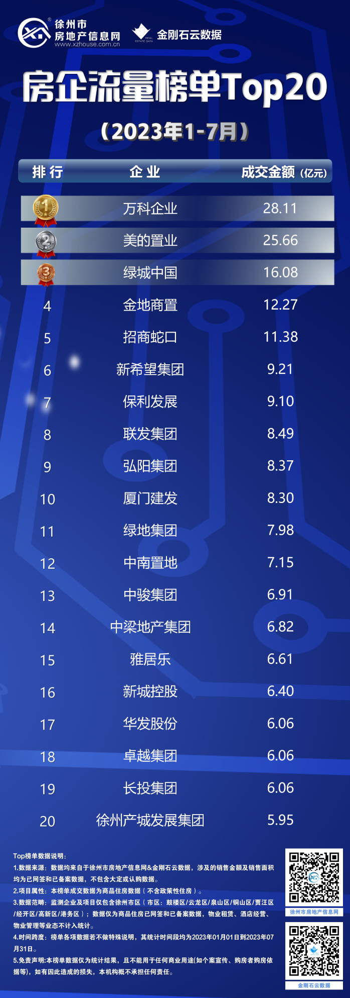 据金刚石云数据统计,2023年1-7月徐州主城区房企流量销售排行榜,万科企业、美的置业、绿城中国持续霸榜top3,其中万科企业以成交总额28.11亿元位列榜首,美的置业成交总额25.66亿元排名第二,绿城中国成交总额16.03亿元排名第三,TOP3销额皆超15亿元,优势明显。万科企业、美的置业深耕徐州多年,品牌认可度高,且市场份额占比高,近年成交一直居于前列,绿城多个项目共同发力稳居第三。