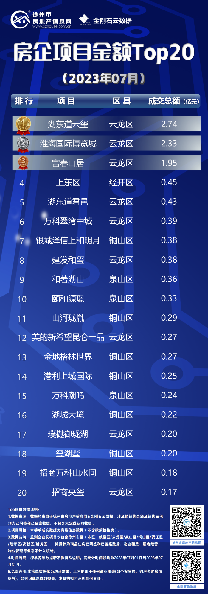 据金刚石云数据统计,2023年7月徐州主城区项目销售总额排行榜,湖东道云玺以2.74亿元位居第一;淮海国际博览城以2.33亿元排名第二;富春山居以1.95亿元成交额排名第三。7月为传统楼市淡季,虽较之6月销额环比略有下滑,但考虑跌幅较小,加之网签项目价格存在差异等因素,故整体表现仍相对平稳,预计8月将呈持续恢复态势。