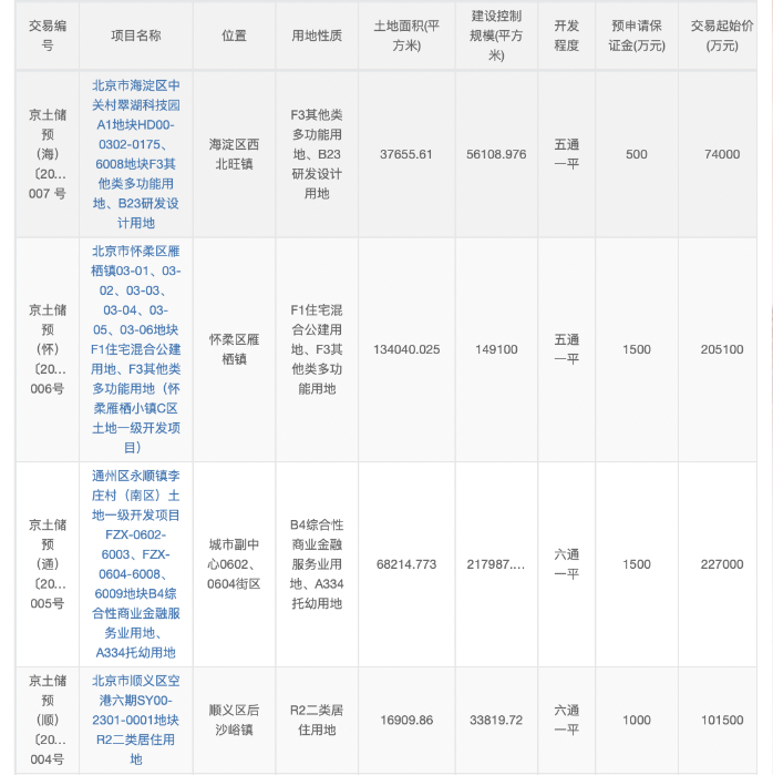 公告显示,土地面积最大的北京市怀柔区雁栖镇03-01、03-02、03-03、03-04、03-05、03-06地块F1住宅混合公建用地、F3其他类多功能用地(怀柔雁栖小镇C区土地一级开发项目),为134040.025平方米,建筑控制规模最大149100平方米,交易起始价20.51亿元。