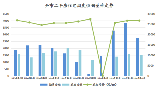 本周二手房挂牌套数2751套,环比下降28%;成交1533套,环比下降4%;成交均价26688元/㎡,环比上涨0%。