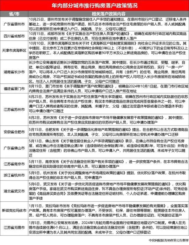 据中房网不完全统计,2024年以来,全国至少有江苏省苏州市、南京市、无锡市,广东省惠州市、佛山市,四川省成都市,福建省厦门市,安徽省合肥市,浙江省杭州市,湖南省长沙市、湖北省武汉市,新疆克拉玛依市和天津市滨海新区13地出台了购房即可申请落户的相关政策。