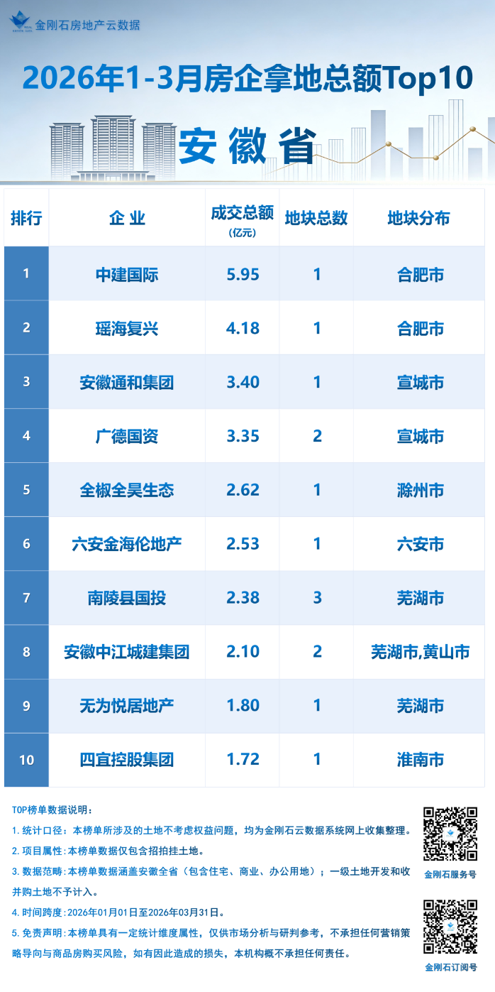 金刚石安徽省2026年1-3月&3月房企拿地金额排行榜重磅出炉。