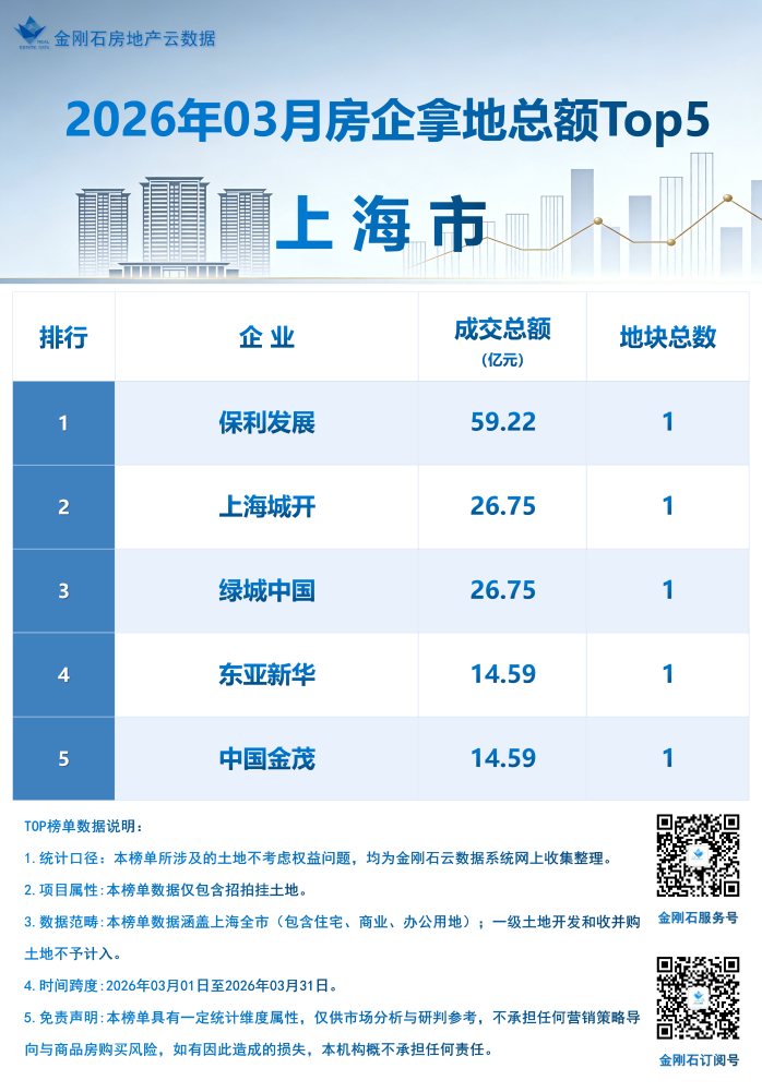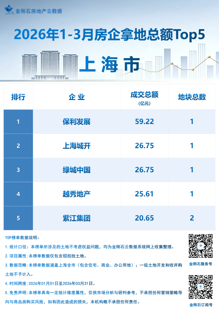金刚石上海市2026年1-3月&3月房企拿地金额排行榜重磅出炉。